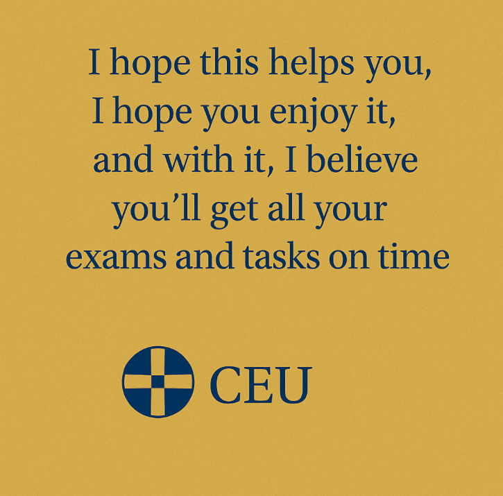 This app called 'ceu's helper' only works with ceu students and the calendar is organised by months. You will have to register with your ceu email. Once you have done that, you will have to complete the calendar so that it can recommend you. After all of this, you will just have to search for the subjects you want to have summarized texts or mind maps, the unit of which is the exam going to be and the grade you are in.