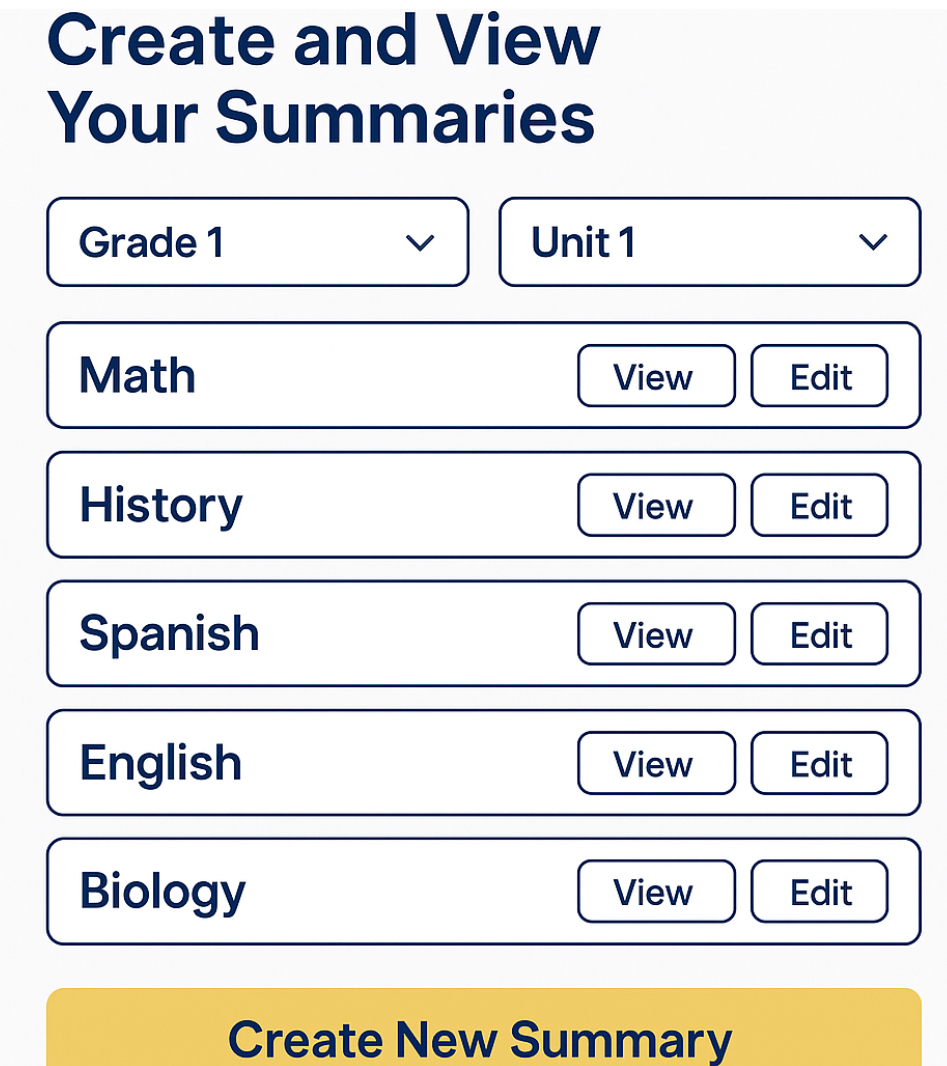 Once you have organized your afternoons and see what tasks you have to do, as I said, I recommend you to start studying and see what the exam is going to be about. If you click on summaries, it will appear this. You will have to select your grade, the unit the exam is going to be about and the subject. Inmediately, you will have a summary or a mindmap of what you have to study.